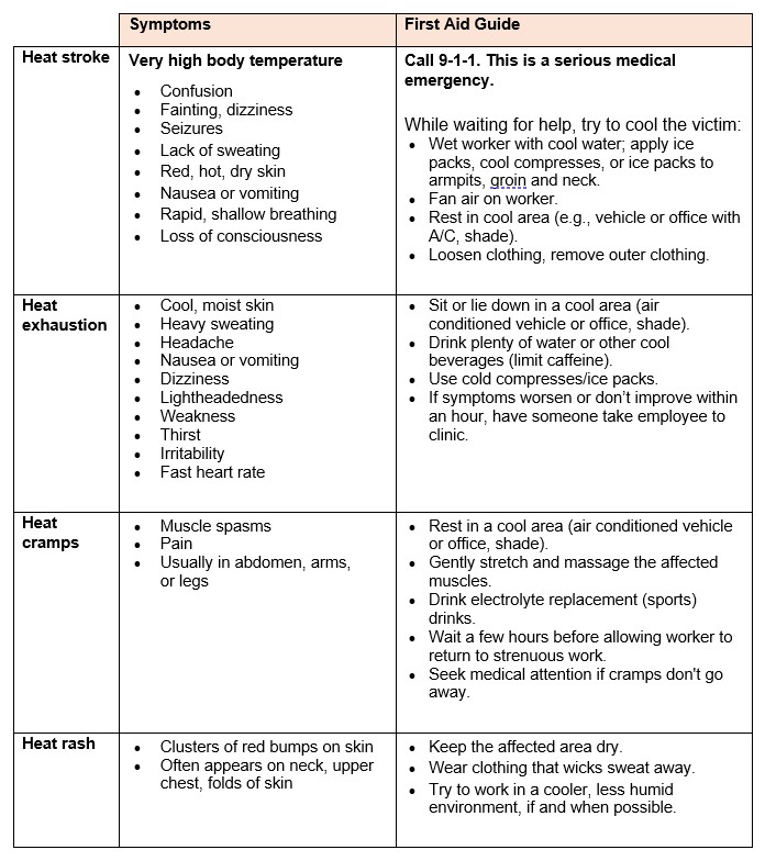 - Signs and symptoms and first-aid information for heat-related illnesses