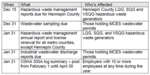 The other metro counties (Ramsey, Washington, Dakota, Scott, Carver, Anoka) won’t send their hazardous waste reporting reminders until after January 1.